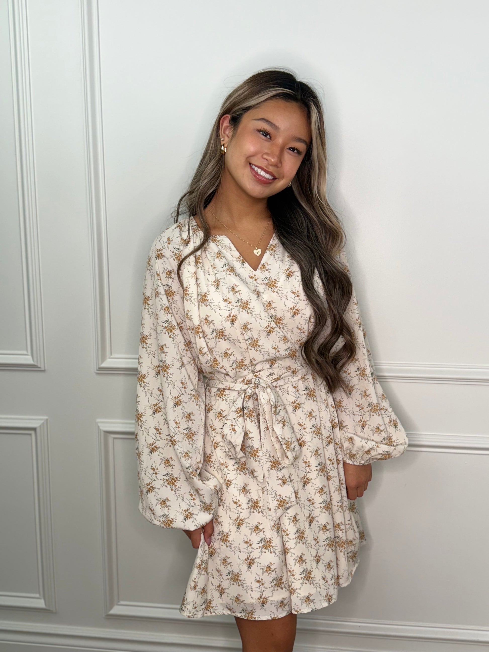Romantic Floral Shirred Mini Dress With Waist Belt and Pleats