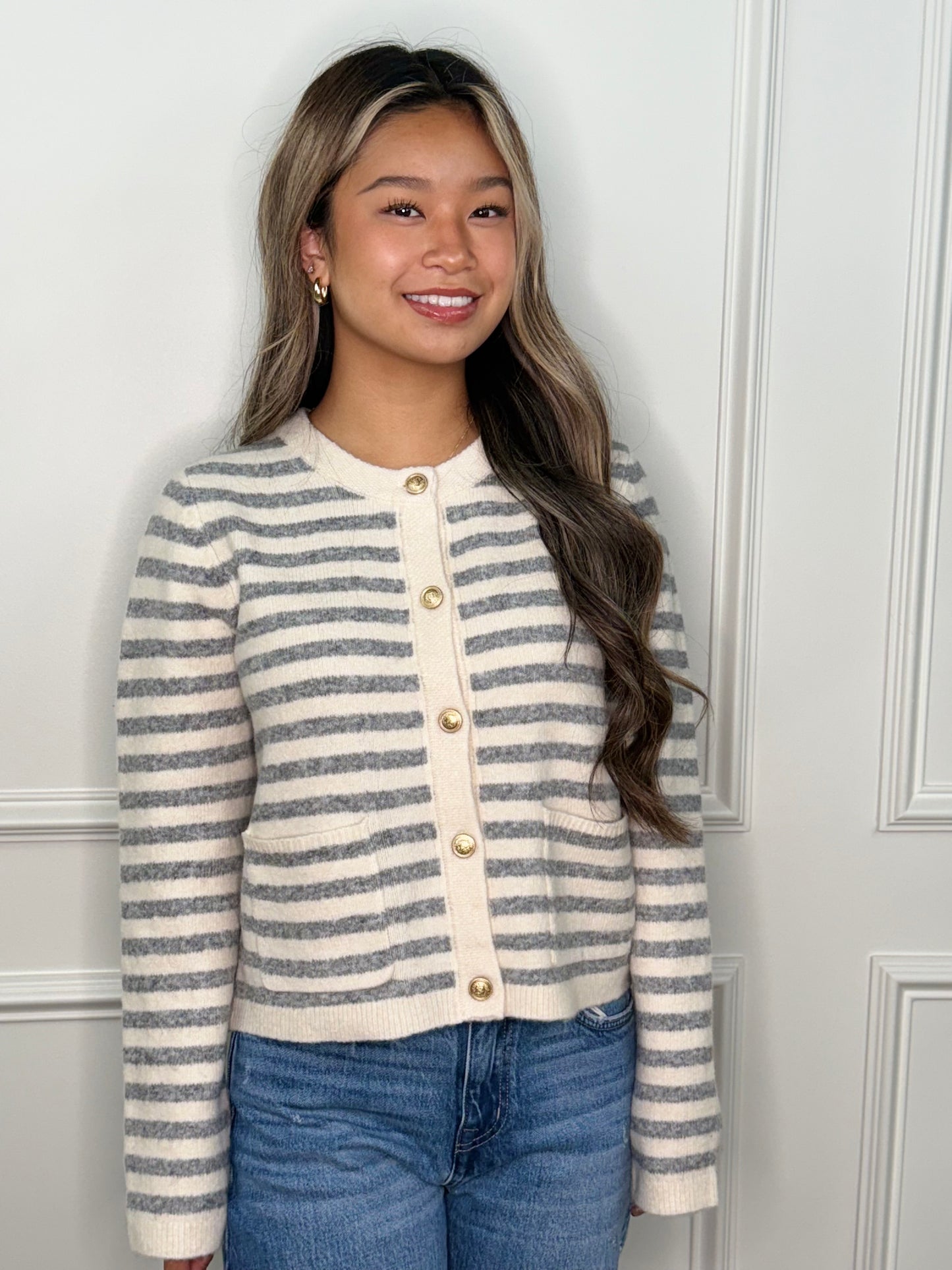 Ultra Soft, Striped, Wool Blend Button Up Long Sleeve Cardigan W/ Accent Buttons and Pockets