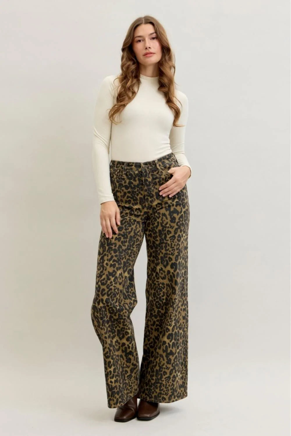 Judy Blue High Waist Retro Leopard Wide Leg Denim Jeans